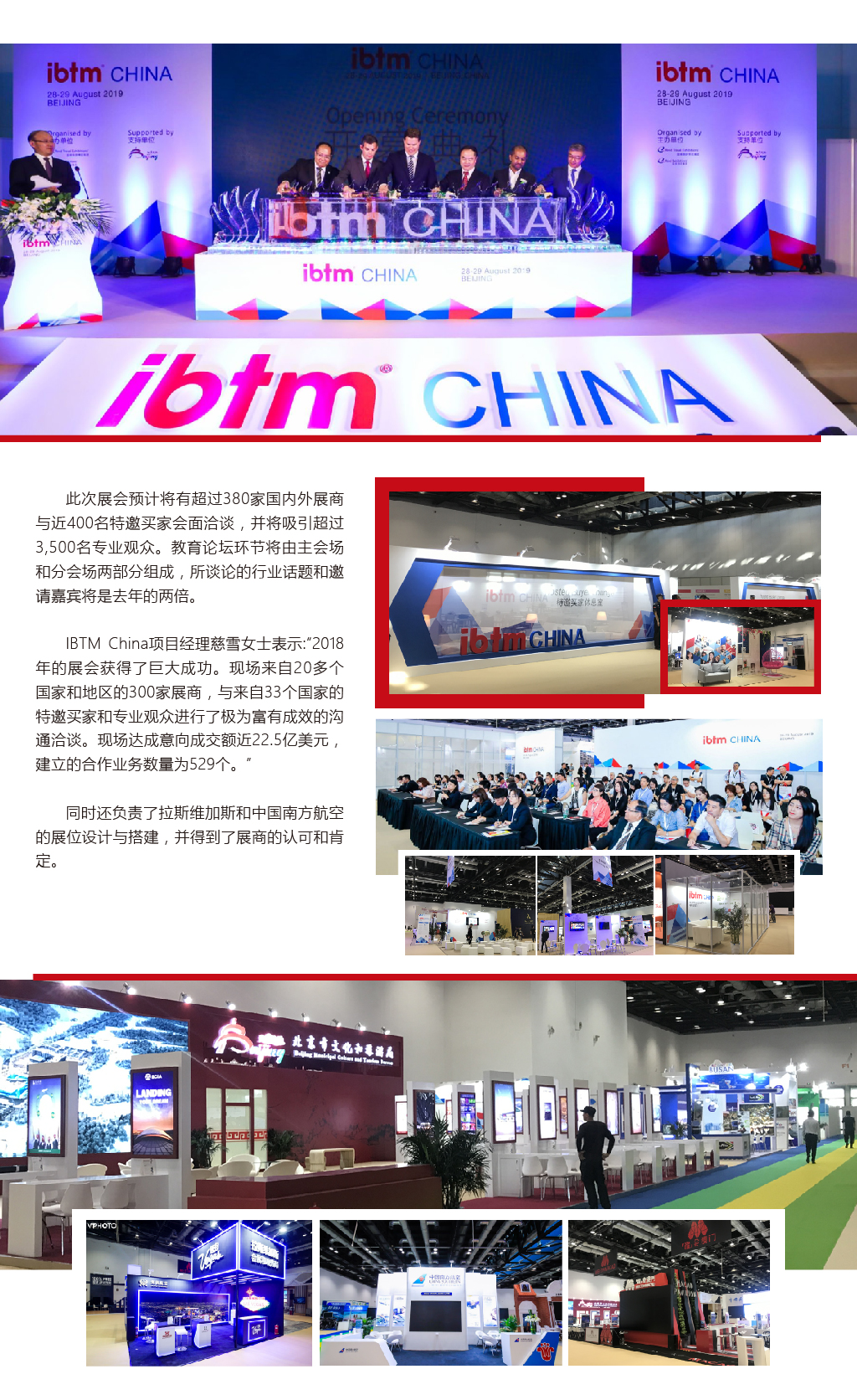 IBTM China作為勵(lì)展旅游展覽集團(tuán)旗下ibtm®系列展覽的中國(guó)站 -- 首次披露其2019年展會(huì)具體信息。主辦方明年將增大國(guó)內(nèi)二三線城市和亞太區(qū)域內(nèi)特邀買家的邀請(qǐng)比例。引進(jìn)“Happy Hour”環(huán)節(jié)并增設(shè)“互動(dòng)體驗(yàn)區(qū)”,增強(qiáng)展商和特邀買家的現(xiàn)場(chǎng)多維互動(dòng),力圖通過(guò)創(chuàng)造一系列全新社交活動(dòng)以促進(jìn)展商和買家建立有效的商務(wù)合作。盛典公司為本次展會(huì)提供了主場(chǎng)運(yùn)營(yíng)及主場(chǎng)搭建服務(wù),同時(shí)負(fù)責(zé)拉斯維加斯會(huì)展和觀光局、海南航空展臺(tái)的搭建,獲得了展商及主辦方的認(rèn)可。